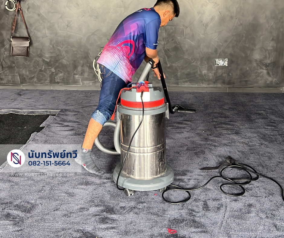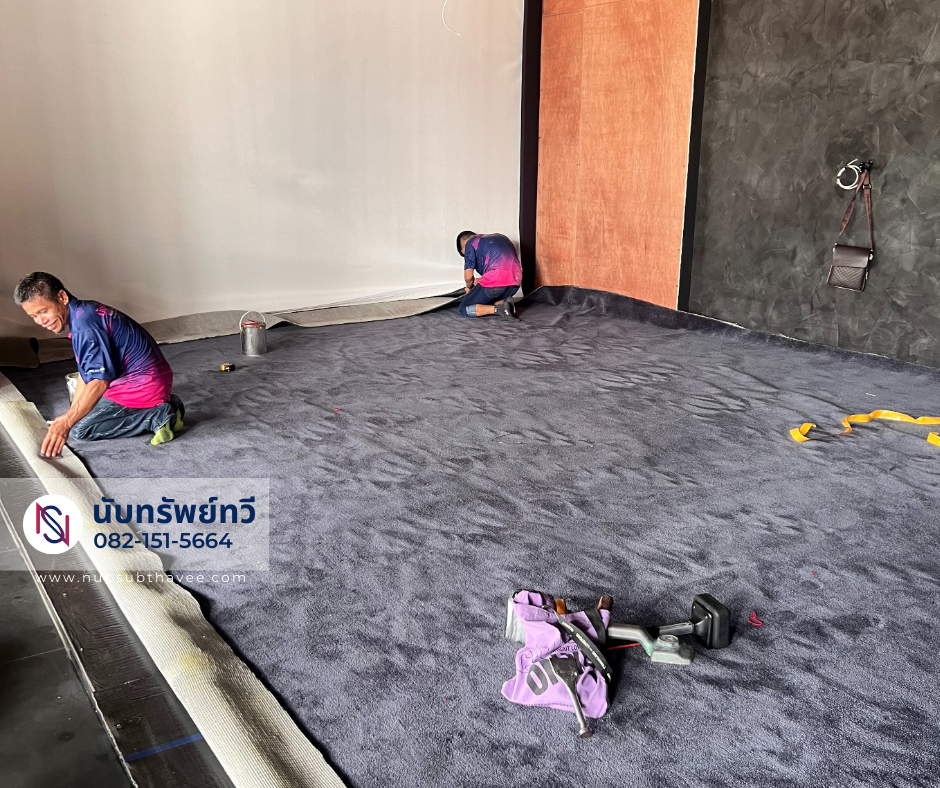 ช่างปูพรมของเราได้ทำติดตั้งพรมรอบบริเวณพื้นที่ซ้อม ลูกค้าเลือกเป็นพรมทอสีเทาเข้ม