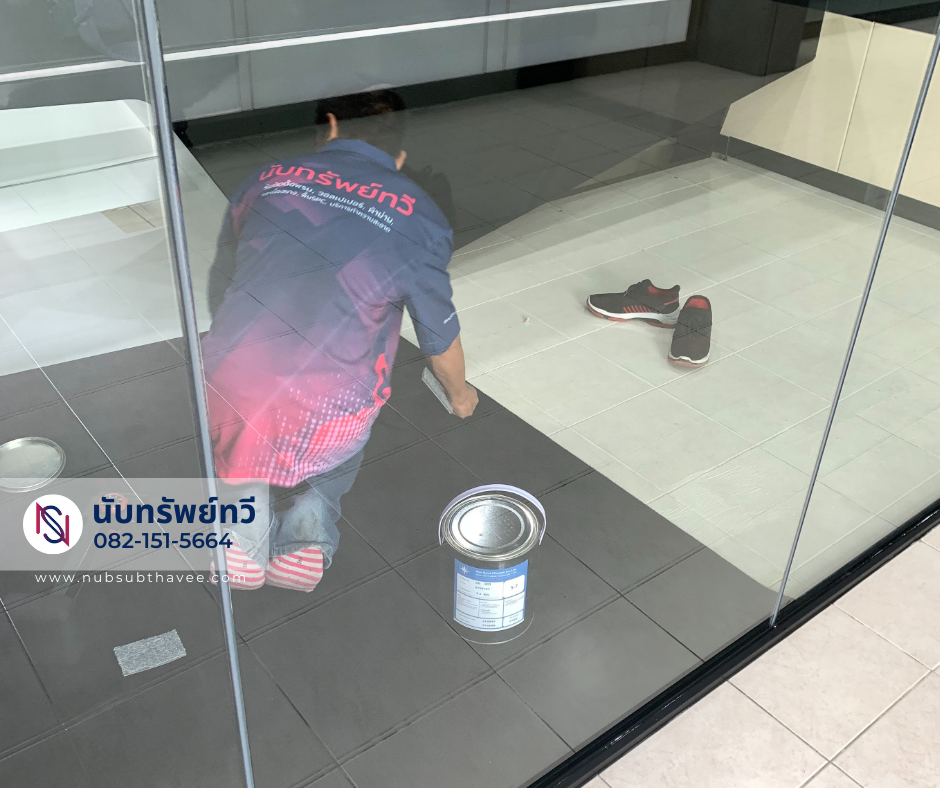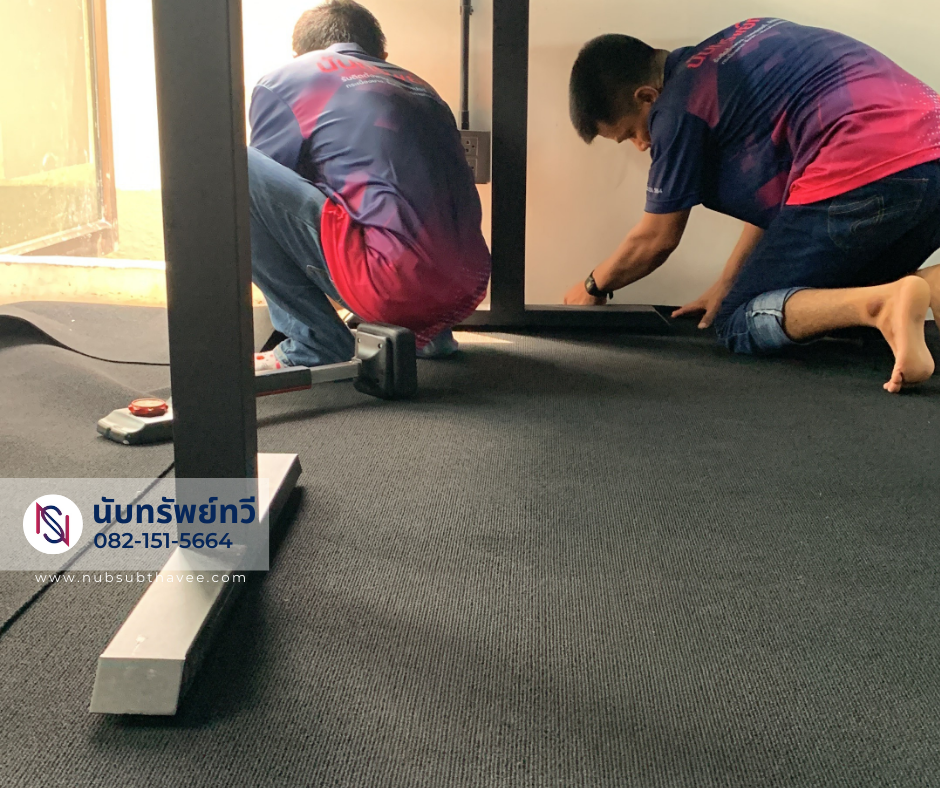 พรมอัดที่เลือกใช้จะเป็นพรมอัดลูกฟูก เพิ่มลูกเล่นให้กับสถานที่ ติดตั้งพรมโดยใช้กาวปูพรมและกาวยางเพื่อยืดตามจุดรอยต่อต่างๆให้แน่น เก็บชายพรมที่หน้าประตูด้วยตัวจบพรมยางสีดำเข้ากับพรม